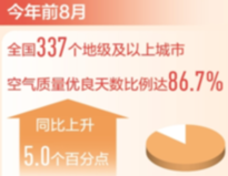 前8月,空气优良天数比例达86.7%