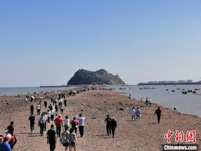落潮时,锦州笔架山“天桥”完全显露出来,游客沿着“天桥”走向笔架山。李晛摄中新网锦州8月23日电…