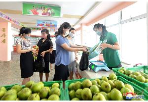朝中社平壤8月22日电满载水果郡收获的梨子的列车抵达平壤。今年7月也水果郡人民把收获的首批桃子运…