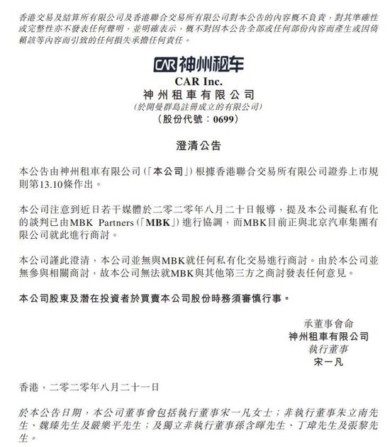 神州租车:并无与MBK就任何私有化交易进行商讨