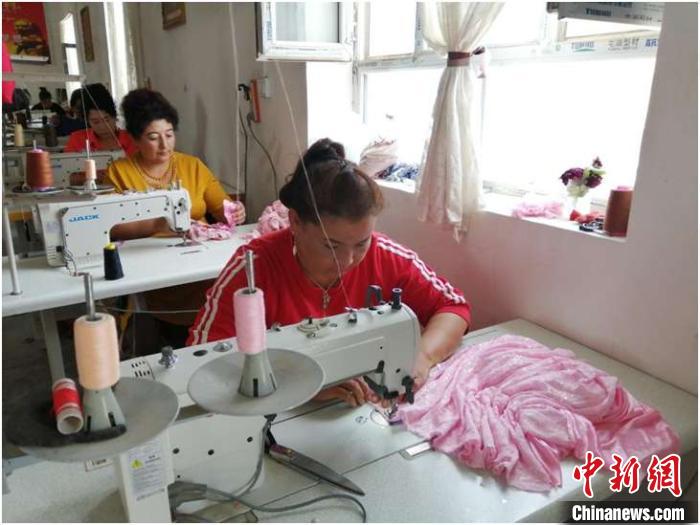 麦盖提县吐曼塔勒村靓丽工程合作社的员工正在制作服装。张建军摄中新网新疆喀什8月15日电(尔志毅苏…