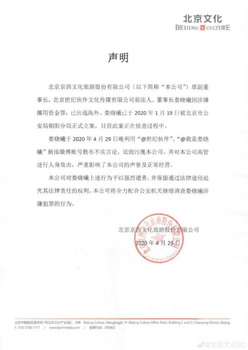 北京文化深夜回应娄晓曦实名举报:诋毁污蔑,举报人已出逃海外