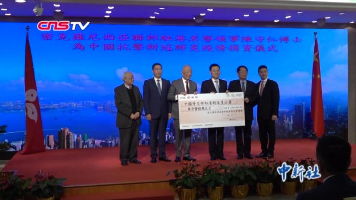 【解说】2月28日,密克罗尼西亚驻港名誉领事陈守仁支援国家抗击新冠肺炎疫情捐资仪式在外交部驻港特…