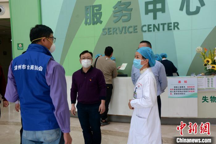 漳州市台商投资企业协会慰问人员与漳州市第三医院医护人员亲切交流。龚雯摄中新网漳州2月28日电(龚…