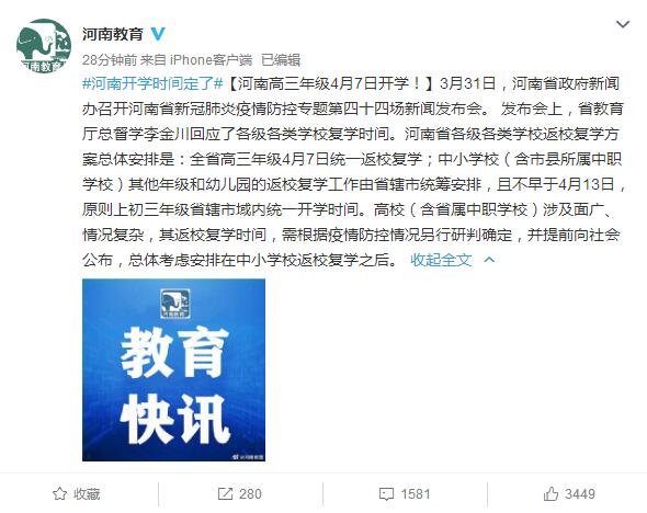 据河南省教育厅官方微博消息,河南省高三年级4月7日统一返校复学;中小学校(含市县所属中职学校)其…