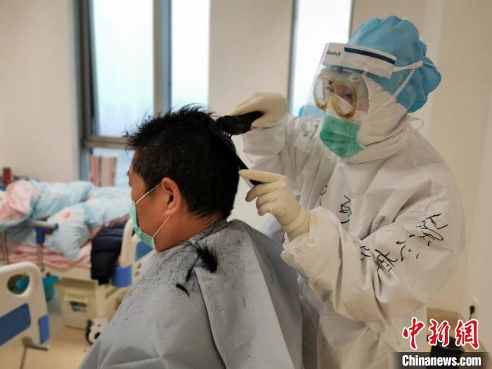 护理人员为患者理发孙洋摄(抗击新冠肺炎)战“疫”一线护士当起“理发师”暖心之举受称赞中新网武汉2…