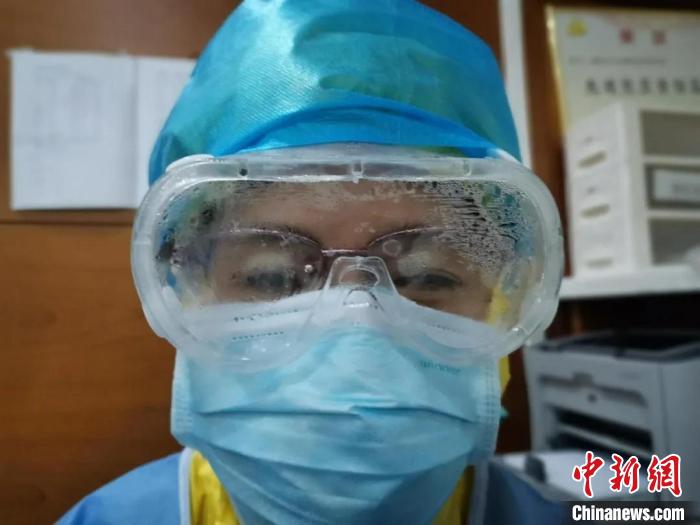 图为:护目镜上一层雾气恩泽医疗供图摄(抗击新冠肺炎)浙江台州援汉医护:即使戴三双手套也要“一针见…