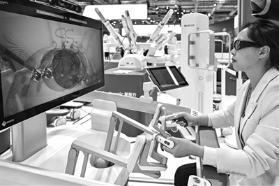 参会者在第七届进博会医疗器械及医药保健展区体验操作一款外科手术机器人。(资料照片)在医疗科技飞速…