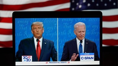 这张2020年10月22日在美国弗吉尼亚州阿灵顿拍摄的视频画面显示,时任美国总统特朗普(左)与时…