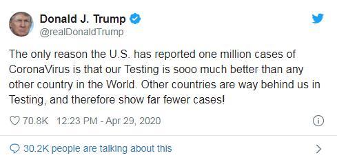 特朗普称美国确诊破百万原因只有一个:检测做的好
