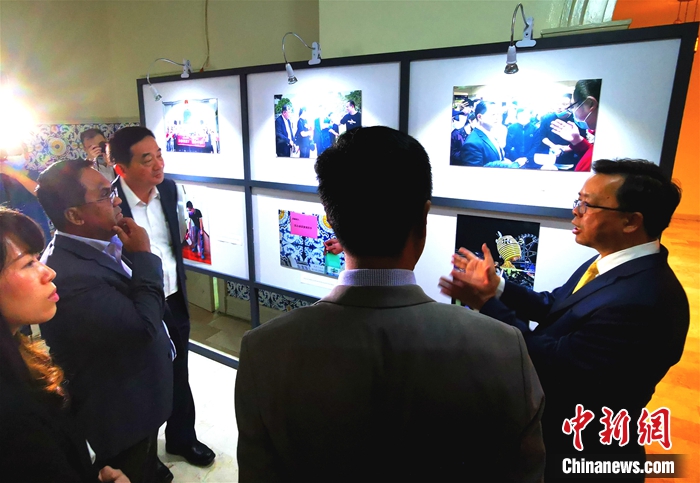 中国驻菲律宾使馆2月27日举办抗击新冠肺炎疫情图片展。菲律宾外交部副部长、东盟事务高官马纳罗、东…
