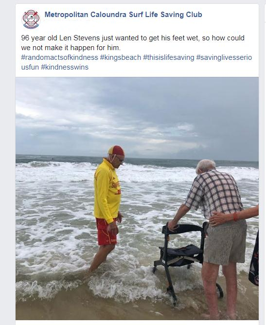96岁的老人伦恩•史蒂文斯(LenStevens)有一个愿望,那就是将脚放入海水中。近日,澳大利…