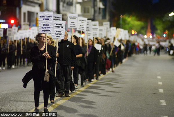 乌拉圭蒙得维的亚,反对杀害妇女和对妇女使用暴力的人们走上街头家庭暴力是一个全球性问题。据世界卫生…