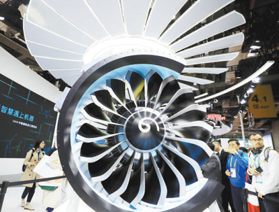 11月5日至10日,第二届中国国际进口博览会在上海举行。图为观众在美国通用电气展台参观LEAP发…