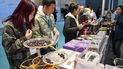 11月16日,观众在第七届丝博会印度尼西亚展位上参观选购食品。新华社记者邵瑞摄新华社西安11月1…