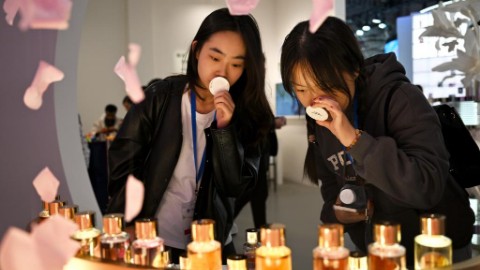 2024年11月9日,观众在第七届进博会欧莱雅展台试闻香水。欧莱雅是进博会七届“全勤生”。新华社…