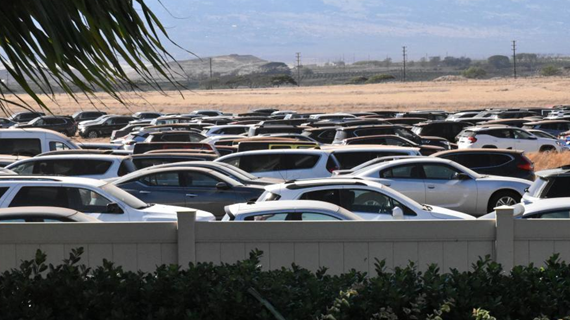 25日,美国夏威夷毛伊岛最大机场卡胡卢伊机场外一片空地上,租车公司的上百辆汽车静静地闲置在那里,…