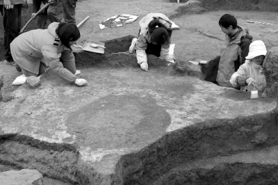 北大考古专业学生在周公庙遗址实习时,清理一个史前房址的地面与灶坑。在首都博物馆举办的“南昌汉代海…