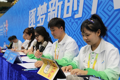 10月21日,广西大学学青会羽毛球赛事志愿者在进行现场播报工作。魏良瑾/摄第一届全国学生(青年)…