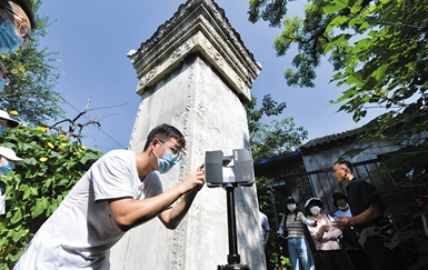 2022年8月,北京建筑大学师生团队给正阳桥疏渠记碑做“体检”。北京建筑大学教师董友强(左二)和…