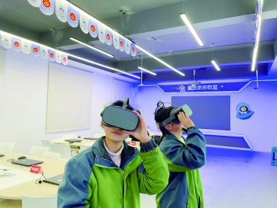 带着VR眼镜的马菲雅(左)和廖文婷。黄婷/摄文县二中“未来教室”。信息技术课教师冉玲莉在“未来教…