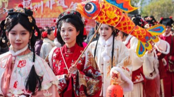 12月31日拍摄的年货节汉服巡游展示。当日,“宋韵思潮寻迹匠心”杭州非遗年货节在杭州市上城区望江…