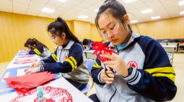 1月13日,河北省遵化市第三中学的学生在创作迎春剪纸作品。春节临近,河北省遵化市第三中学组织剪纸…