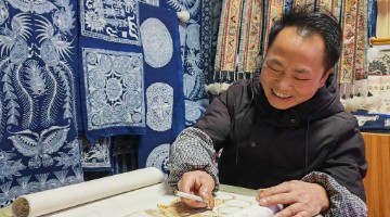 45岁的苗族汉子万远神情专注,手持蜡刀,蘸上蜡液,一勾一画间,一只栩栩如生的蝴蝶图案跃然于画布之…