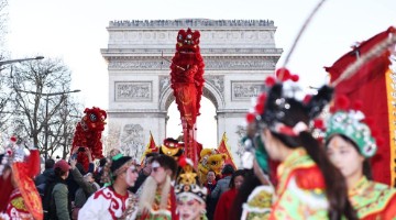 2月2日,来自广东汕头潮阳的西门英歌队在法国巴黎香榭丽舍大街表演。2日,“欢乐春节满巴黎,龙狮贺…