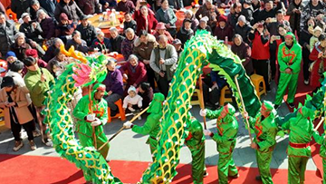 12月16日,在德清县莫干山镇后坞村,村民和游客观看舞龙表演(无人机照片)。当日,浙江省湖州市德…
