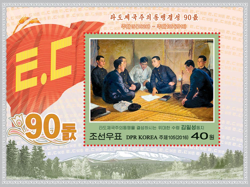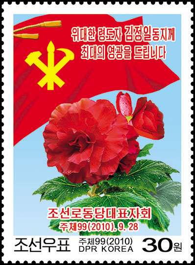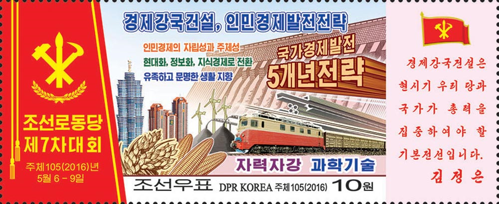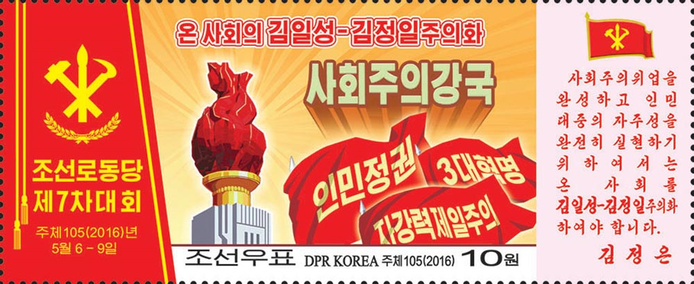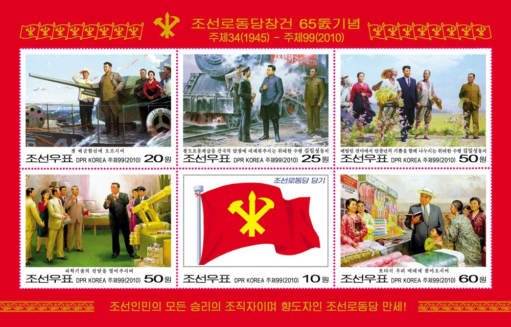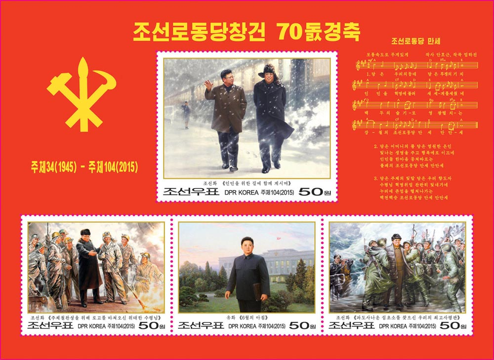 值朝鲜劳动党建党75周年之际,朝鲜民主主义人民共和国举办了《朝鲜劳动党,光荣的75年》邮票展,以下为展出的邮票图片。