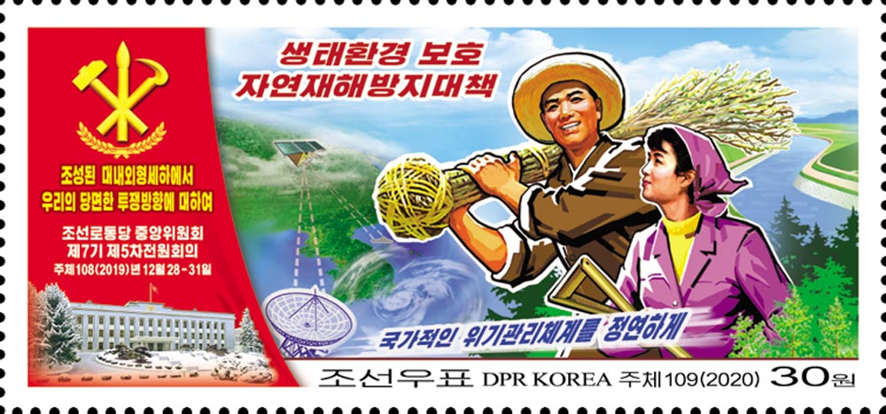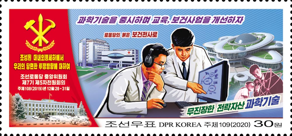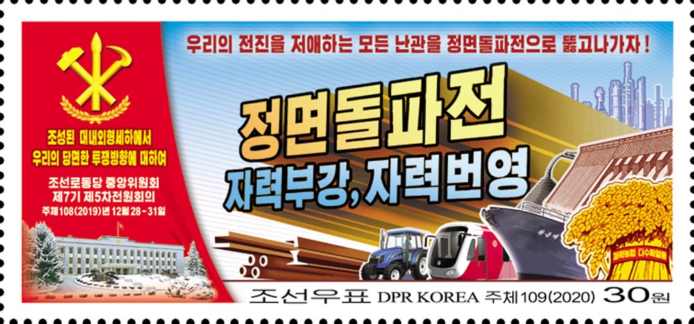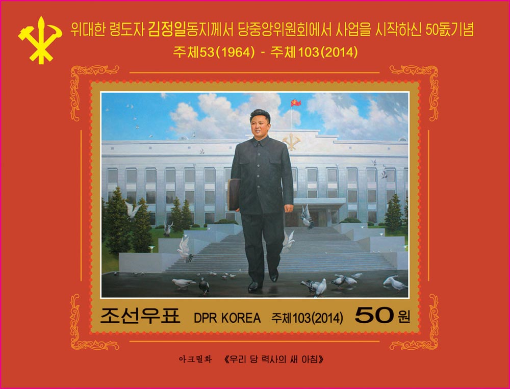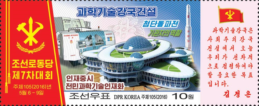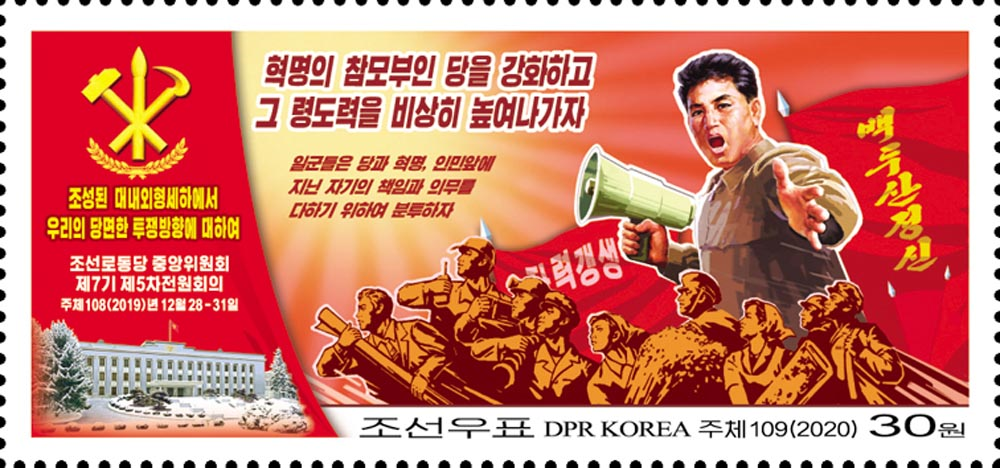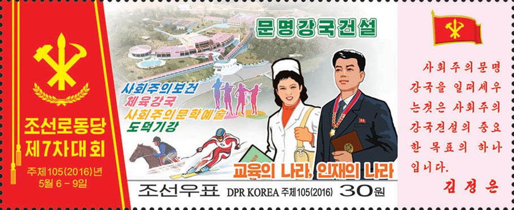 值朝鲜劳动党建党75周年之际,朝鲜民主主义人民共和国举办了《朝鲜劳动党,光荣的75年》邮票展,以下为展出的邮票图片。