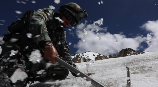 侦察小分队穿越冰川,攀登海拔6000多米的雪峰,挑战身体极限。冰川地带地形复杂,环境恶劣,空气含氧量约为平原地区百分之三十,在冰川地域进行穿插渗透是侦察分队必须掌握的作战技能,对体能和专业技能要求都较高。