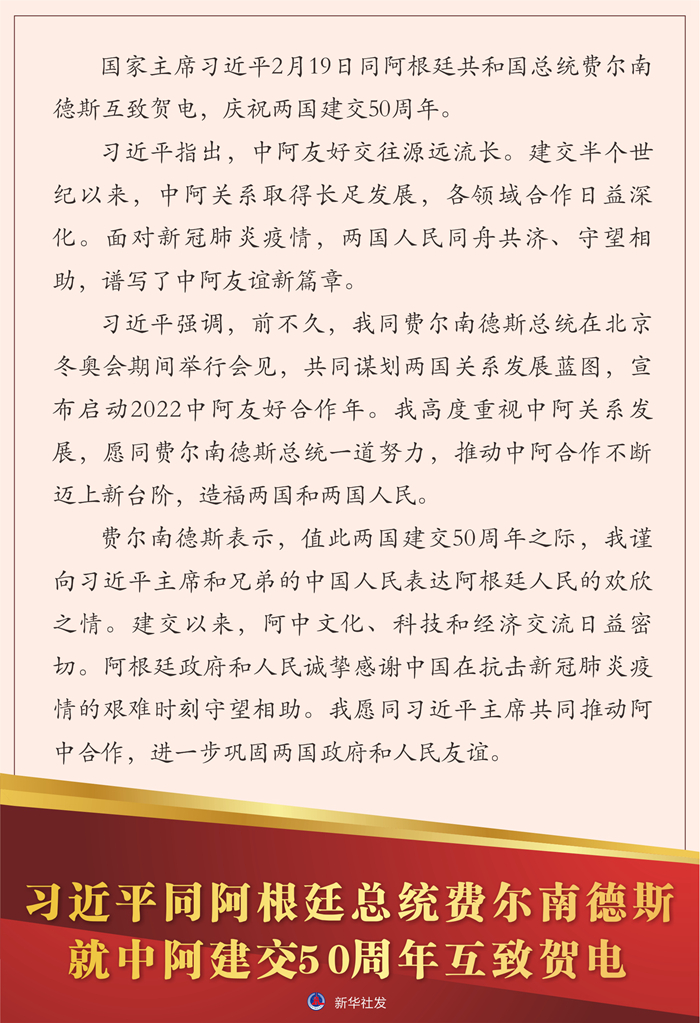 费尔南德斯表示,值此两国建交50周年之际,我谨向习近平主席和兄弟的中国人民表达阿根廷人民的欢欣之情。建交以来,阿中文化、科技和经济交流日益密切。阿根廷政府和人民诚挚感谢中国在抗击新冠肺炎疫情的艰难时刻守望相助。我愿同习近平主席共同推动阿中合作,进一步巩固两国政府和人民友谊。