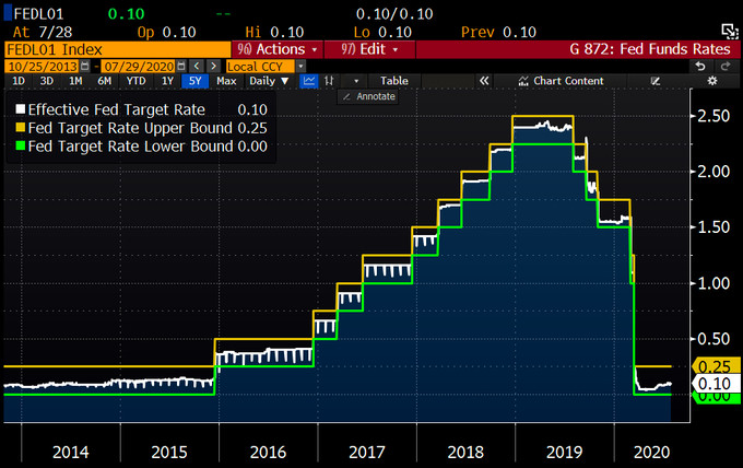 新冠病毒重新蔓延严重伤害美国经济复苏,美国经济在第二季遭遇至少1940年代以来最严重的衰退,暴跌32.9%,美联储在7月30日利率决议后的发布会上表示,将不惜一切地采取行动来支持经济,甚至都没想过要提高利率。