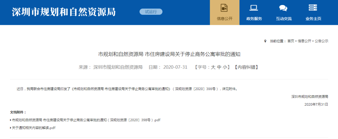 7月31日,深圳市规划和自然资源局、深圳市住房和建设局联合发出通知,停止商务公寓审批。通知自发布之日起施行。