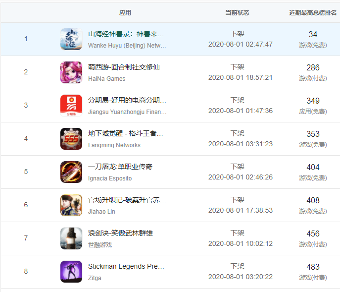 而在8月1日下架的软件中,下载总榜排名多在300名以后,其中近期下载量最高的一款手游“山海经神兽录”,总榜排名34位。
