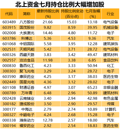 七月北上资金加仓股共852只,加仓幅度超1个百分点的有109只。具体来看,八方股份的加仓幅度最为明显,北上资金最新持股比例21.66%,环比增加15.03个百分点;紧随其后是国茂股份,持股比例环比增加8.59个百分点;其他加仓比例靠前的还有大族激光、科博达、中铝国际等。