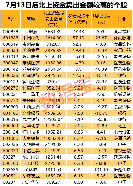 7月13日到达阶段新高后,沪指开始了震荡下跌的走势,赚钱效应转差。7月14日,北上资金创下单日流出A股的历史记录,此后除个别日期外,整体呈大幅流出的趋势。那么7月13日开始的这段震荡行情里,北上资金重点减持了哪些标的呢?