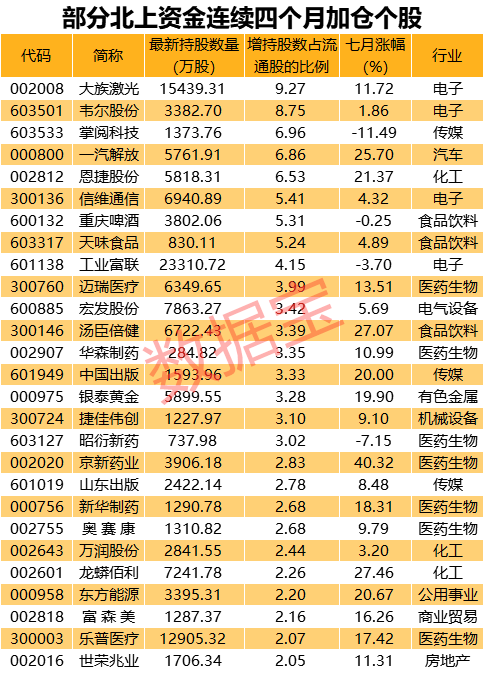 北上资金七月重点买入109股