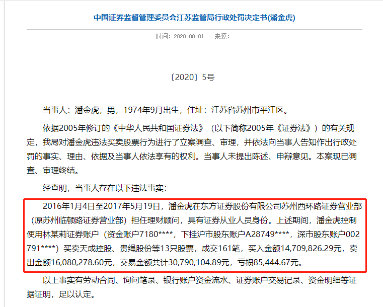 8月1日,江苏证监局发布对东方证券股份有限公司苏州西环路证券营业部(原苏州临顿路证券营业部)的理财顾问潘金虎的行政处罚决定书显示,2016年1月4日至2017年5月19日,潘金虎在此营业部担任理财顾问,具有证券从业人员身份。上述期间,潘金虎控制使用林某莉证券账户(资金账户7180 ,下挂沪市股东账户A28749,深市股东账户002791****)买卖天成控股、贵绳股份等13只股票,成交161笔,买入金额1470.98万元,卖出金额1608.03万元,交易金额3079.01万元,亏损8.54万元。
