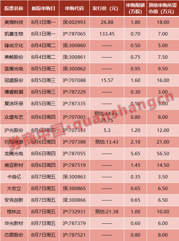 8月3日发行的是奥海科技、凯赛生物;8月4日发行的是锋尚文化、美畅股份;8月5日发行的是蓝盾光电、冠盛股份、博睿数据、复洁环保;8月6日发行的是众望布艺、沪光股份、均瑶健康、龙腾光电、南亚新材;8月7日发行的是卡倍亿、大宏立、安克创新、格林达、华光新材、芯原股份。