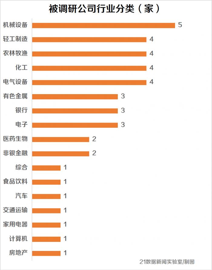 从行业分布来看,机械设备最受机构青睐,埃夫特-U(688165.SH)、润邦股份(002483.SZ)、至纯科技(603690.SH)等5家相关公司被调研,其次是电气设备、化工、农林牧渔、轻工制造行业,均有4家公司获调研。