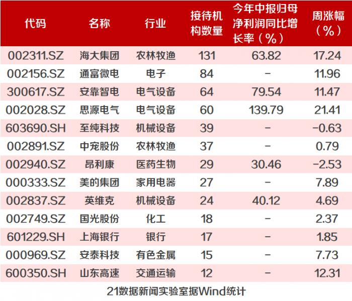 具体到上市公司,机构调研海欣食品(002702.SZ)最频繁,调研次数达5次。其次是广发证券(000776.SZ)、思源电气(002028.SZ)均获得4次调研。其中,海鸥住工和雅化集团过去一周涨幅均在10%以上。其中思源电气、海欣食品在过去一周分别上涨21.4%、18.3%。