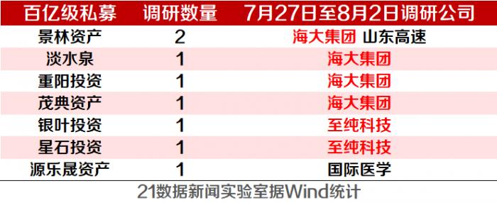 从具体调研机构来看,源乐晟资产、重阳投资、茂典资产等7家百亿知名私募调研了4家公司。其中,海大集团获得了景林资产、淡水泉等4家私募的青睐,银叶投资、星石投资则共同调研了至纯科技。