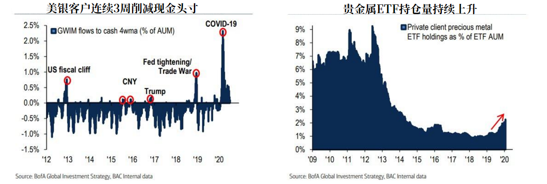 但截至上周,美银私人客户连续三周减少现金持有量——这还是今年头一遭。与此同时,投资者的贵金属ETF投资组合比例上升了2.3%,虽然仍低于2012年的巅峰水平,但投资者对美元和贵金属的喜好已经发生肉眼可见的变化。
