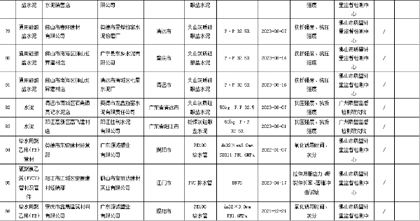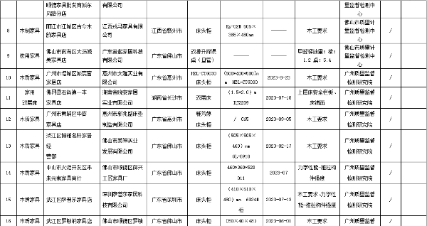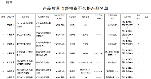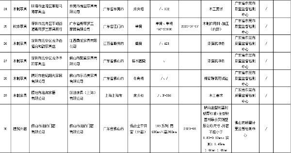 通告显示,本次抽查共发现不合格产品91款(见附件1)。其中,涉及上海市、福建省、江西省、山东省、湖南省、广西壮族自治区等6个省(市)生产单位产品27款,涉及省内广州市、深圳市、佛山市、韶关市、河源市、梅州市、惠州市、汕尾市、东莞市、中山市、江门市、阳江市、湛江市、茂名市、肇庆市、清远市、揭阳市、云浮市等18个地市生产单位产品64款。按产品分类统计,涉及家具29款、建筑门窗15款、人造板32款、水泥7款、塑料管材及管件8款。