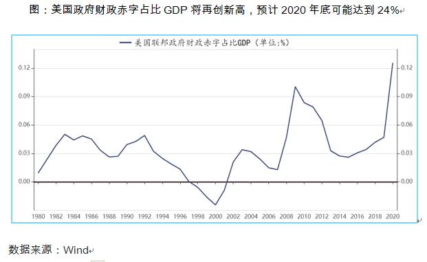 按照截至2020年7月份美国财政赤字2.45万亿美元估算,当前美国联邦政府财政赤字占比2020年折年GDP已经超12.6%,创历史新高。