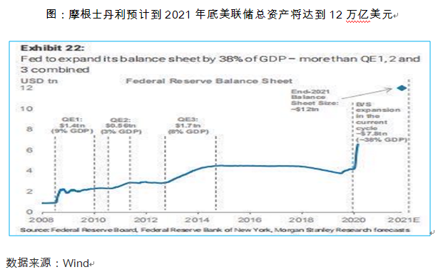最近摩根士丹利在一份报告中分析称,本次美联储QE规模很可能达到7.8万亿美元,超过前三轮QE规模总额,使2021年底美联储总资产达到12万亿美元。