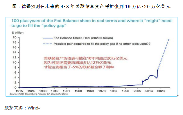 而据德银的估算,美联储在未来4~8年总资产负债表将扩大到19万亿美元。德银利用“影子利率”概念估算发现,到2021年初,所有经济情景下最佳联邦基金利率都应在-4%至-5%之间。由于美联储否认实施负利率的可能性,当前的量化宽松和前瞻指引都可能不够,美联储仍将需要提供大量的宽松政策,才能使“影子利率”降至-4%至-5%这一水平。德银发现,1000亿美元的量化宽松可以将10年期国债期限溢价压缩约3个基点,同时相当于联邦基金利率下调约8个基点的效果。也就是说,美联储必须将资产负债表规模扩大约15万亿美元,才能实现相当于-4.5%左右的政策利率。若以目前每月购买1200亿美元的速度,乐观估计还需要四年,悲观估计则要超过八年。